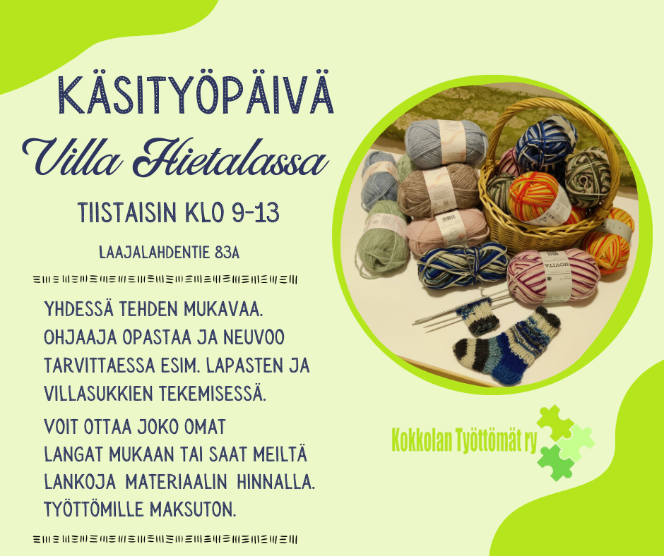 Rentoa yhdessä tekemistä. Kudotaan, ommellaan, neulotaan ja virkataan. Voi myös askarrella, maalata tai käyttää ompelukoneita tai kudontakonetta. Kaikkeen saa opastusta tarpeen vaatiessa. Työttömille maksuton.